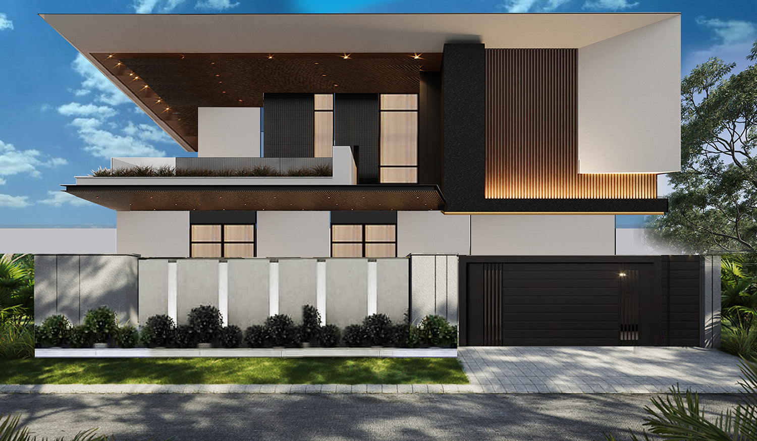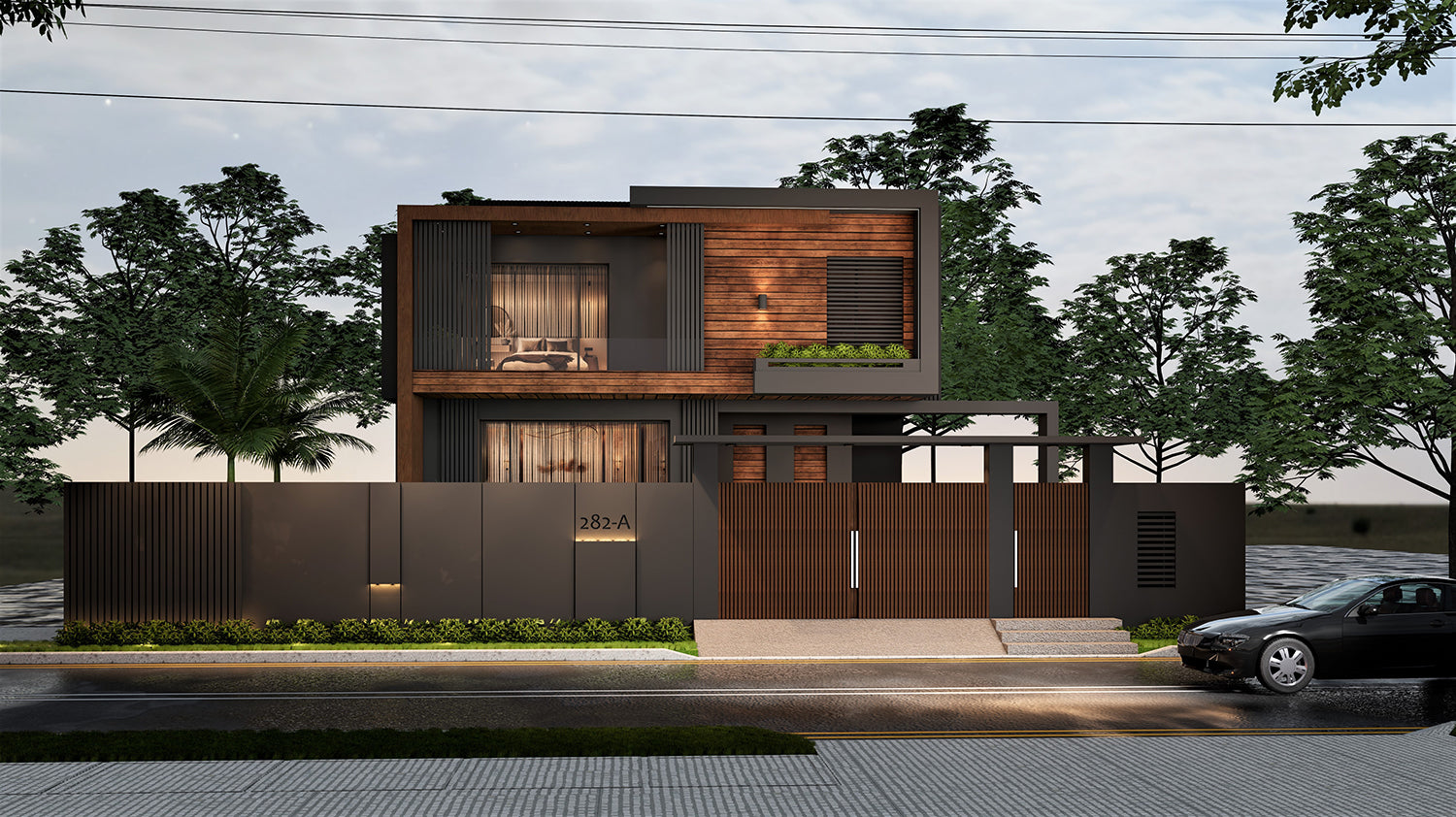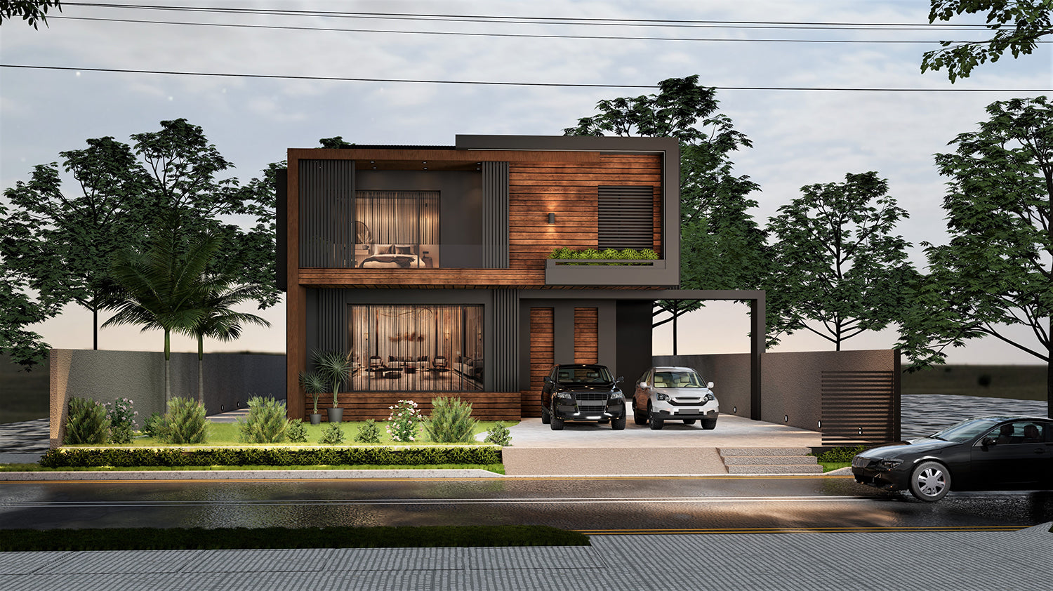 Modern architecture designs depicting a slanted roof, textured boundaries and wood details. Coming altogether to begin to feel at home with its warmth and familiarity