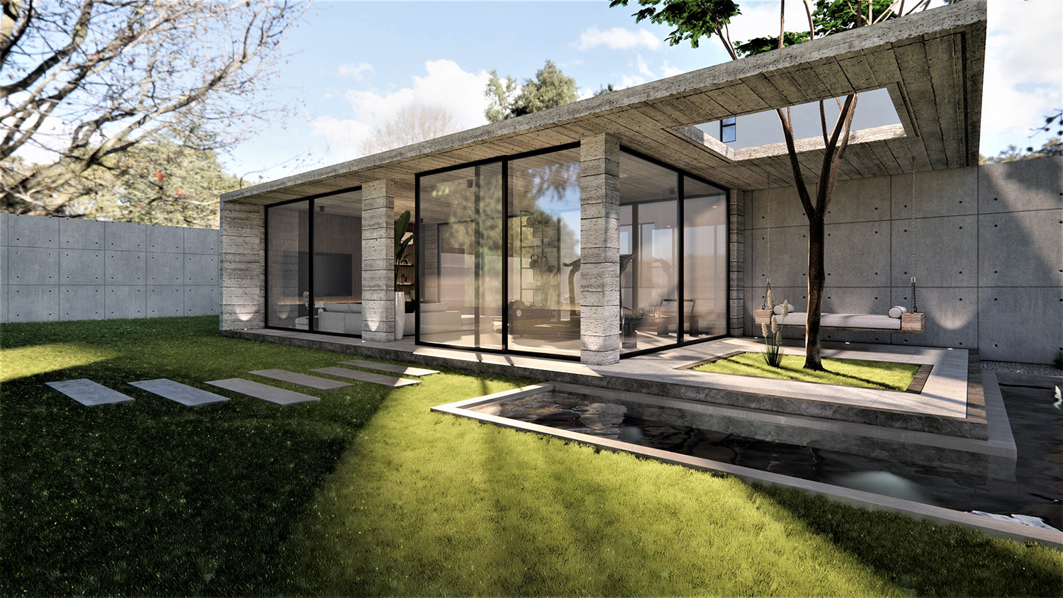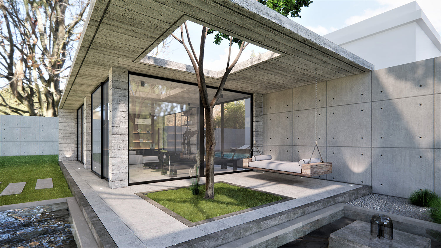 The concept of free spirited architecture, inspired by modernism, playing with an assymetric composition while paying homage to the existing deep rooted tree in the space. A rustic metal swing, rustic stone textures with panoramic glass windows.
